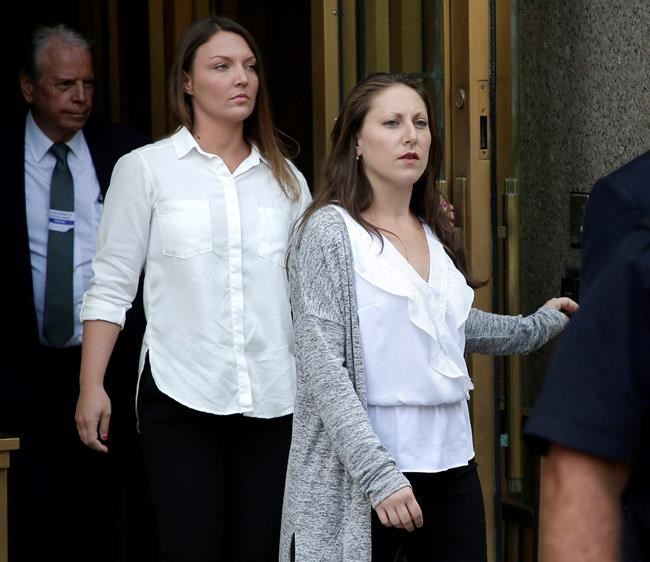 In this Monday, July 8, 2019 photo, Michelle Licata, right, and Courtney Wild, left, leave federal court after wealthy financier Jeffrey Epstein appeared for his arraignment in New York. Licata and Wild, two of Epstein's accusers, say they feel empowered after he was charged with sex trafficking and conspiracy charges. Epstein pleaded not guilty to the charges and will remain jailed until at least July 15 when a bail hearing is set on the case. (AP Photo/Seth Wenig)