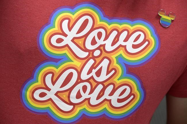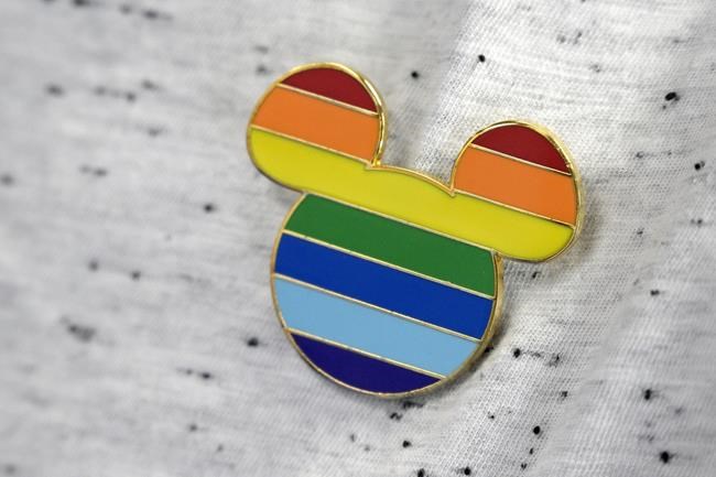 A Disney cast member displays a Mickey Mouse pin on his shirt at The Center, an LGBTQ support organization, while participating in an employee walkout of Walt Disney World, Tuesday, March 22, 2022, in Orlando, Fla. (AP Photo/Phelan M. Ebenhack)