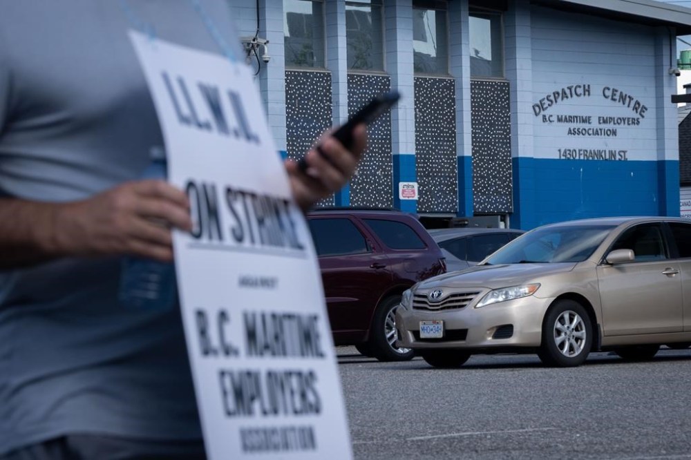 An International Longshore and Warehouse Union worker pickets outside of the BC Maritime Employers Association Dispatch Centre after a 72-hour strike notice and no agreement made on the bargaining table in Vancouver, on Saturday, July 1, 2023. THE CANADIAN PRESS/Ethan Cairns