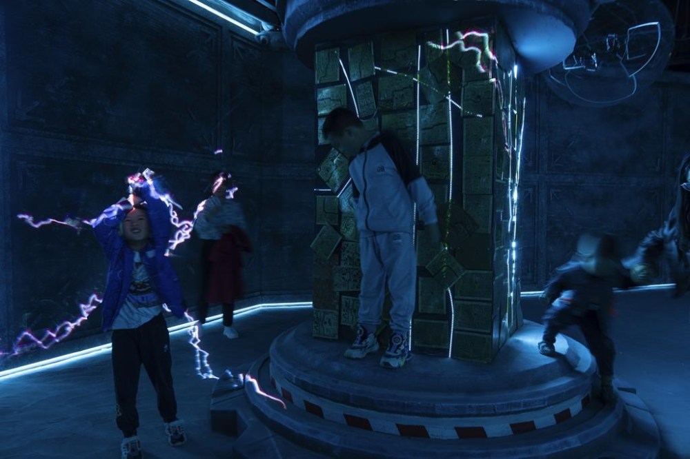 Children play at an exhibition depicting the science fiction universe from a trilogy by Chinese author Liu Cixin in Chengdu, Sichuan province on Saturday, Oct. 21, 2023. The series that began with