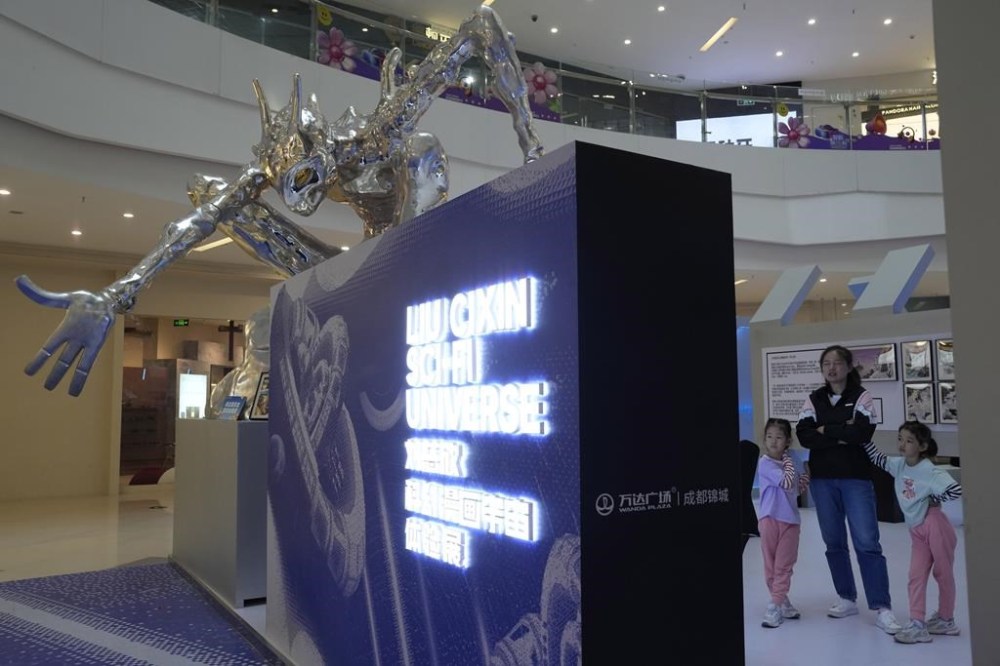 Visitors look at an exhibition depicting the science fiction universe from a trilogy by Chinese author Liu Cixin in Chengdu, Sichuan province on Saturday, Oct. 21, 2023. The series that began with