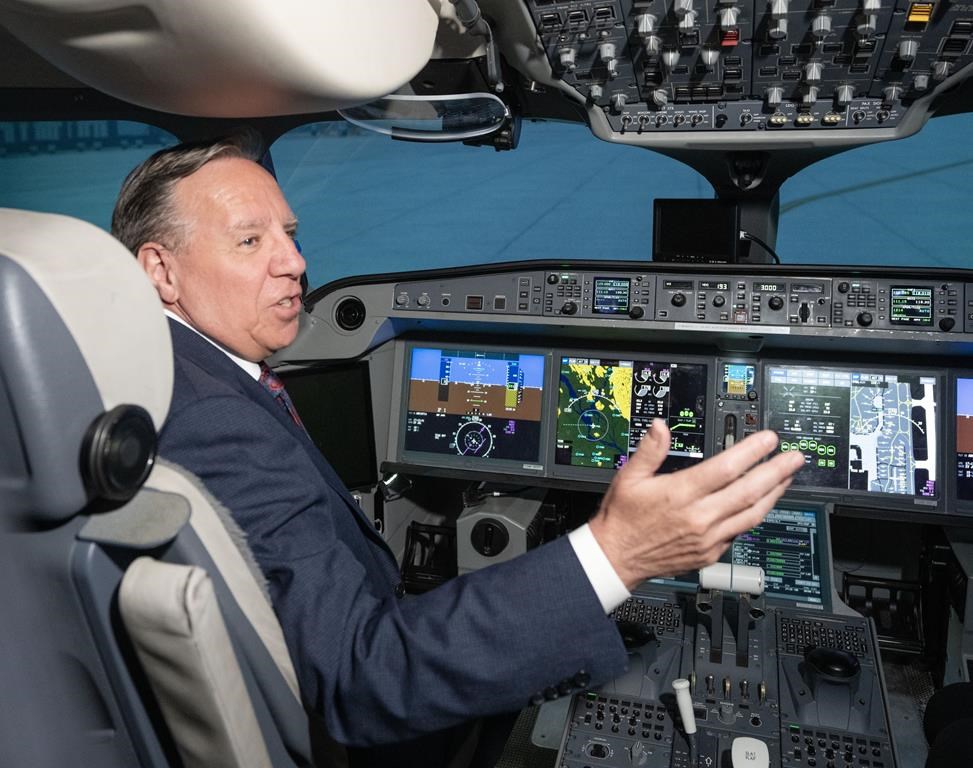 Quebec Premier François Legault tries a flight simulator at the Airbus A220 manufacturing facility in Mirabel, Que., Tuesday, July 23, 2024. The Quebec government is investing $413 million to increase production at the plant. THE CANADIAN PRESS/Ryan Remiorz
