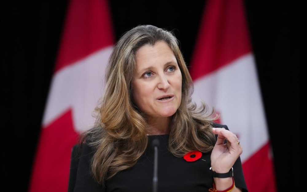 Deputy Prime Minister and Minister of Finance Chrystia Freeland speaks to reporters after a meeting of the Cabinet Committee on Canada-U.S relations following the election of President-elect Donald Trump on Parliament Hill in Ottawa, Friday, Nov. 8, 2024. THE CANADIAN PRESS/Spencer Colby