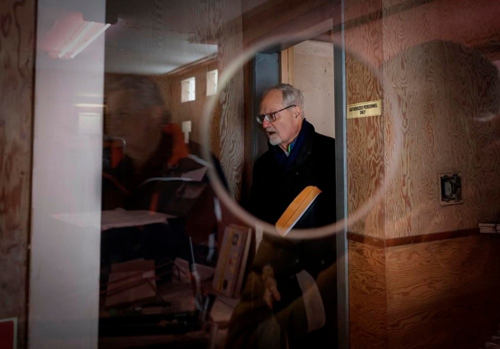 Fred Bradley, who leads efforts to refurbish a Quonset hut theatre originally built in 1948, is seen through the theatre's ticket window in Coleman, Alta., Monday, Nov. 25, 2024. THE CANADIAN PRESS/Jeff McIntosh