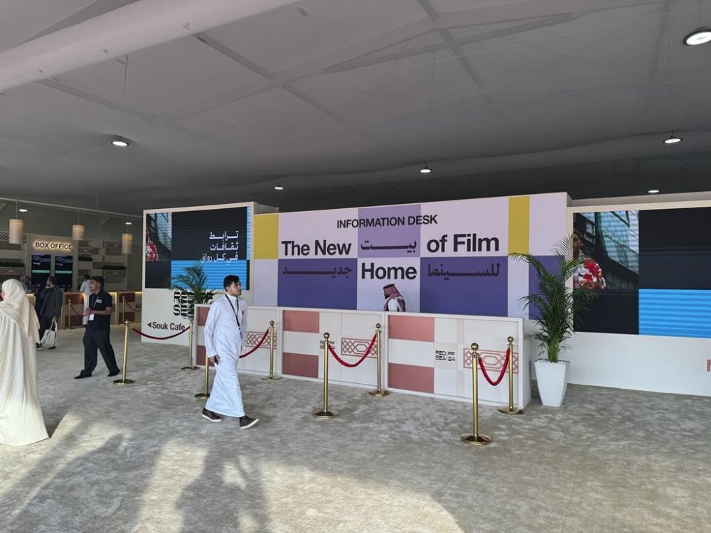 Visitors walk past the information desk at the Red Sea International Film Festival in Jeddah, Saudi Arabia, Thursday, Dec. 5, 2024. (AP Photo/Baraa Anwer)