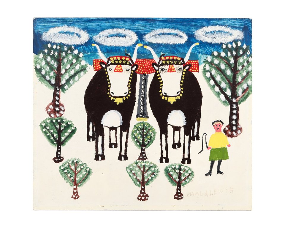 The paintings sold resemble works by Maud Lewis, but her husband would add his own elements, which in the case of the oxen included a figure with a whip next to the oxen.