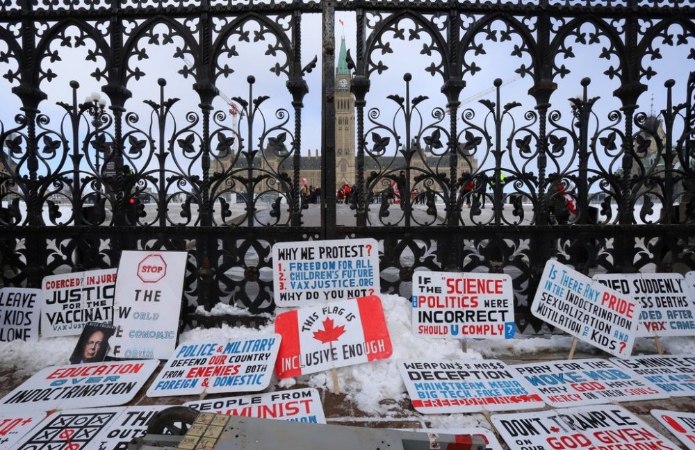 Signs are piled against the gates of Parliament Hill as people protest on the anniversary of the 'Freedom Convoy' demonstrations in Ottawa on Saturday, Feb. 17, 2024. THE CANADIAN PRESS/Patrick Doyle