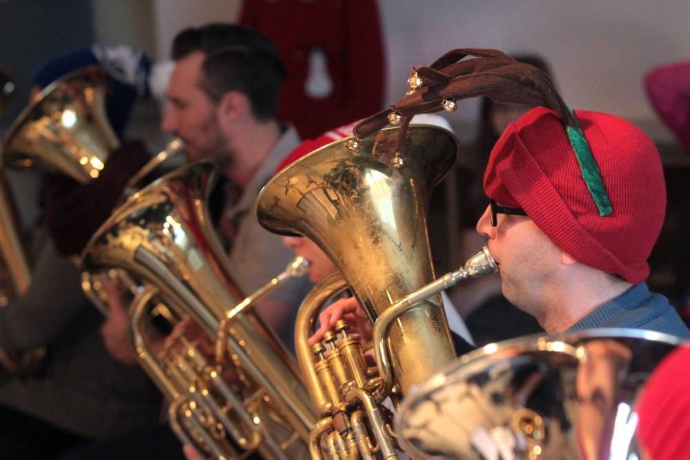 A festively dressed musician joins 29 others for the opening number during the 2016 edition of Tuba Christmas. The Green Spot plays host to this year's Tuba Christmas event on Saturday. (File)