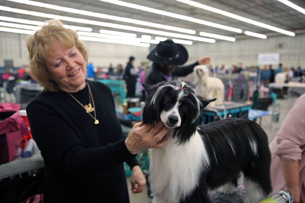 Cindy Egbert inspects Swayze the Chinese crested powderpuff after giving him a thorough combing during the 2023 Wheat City Kennel Club dog show. This year’s show takes place this weekend in the Keystone Centre’s Manitoba Room. (Colin Slark/The Brandon Sun files)