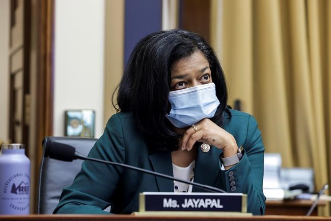 FILE - In this July 29, 2020 file photo, Rep. Pramila Jayapal, D-Wash., speaks during a House Judiciary subcommittee hearing on antitrust on Capitol Hill in Washington. A second Democratic member of the House who was forced to go into lockdown during last week’s violent protest has tested positive for COVID-19. Rep. Pramila Jayapal of Washington says she has tested positive. She criticized Republican members of Congress who declined to wear a mask when it was offered to them. (Graeme Jennings/Pool via AP)