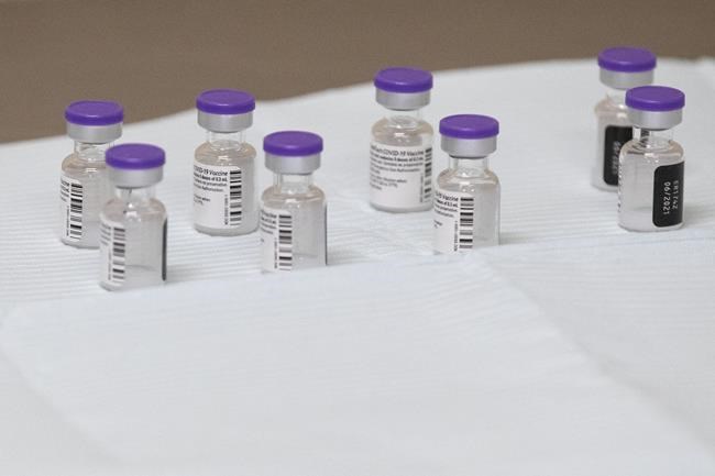 Several vials of Pfizer-BioNTech COVID-19 vaccines at the Strathcona Paper Centre in Napanee, Ont., on Monday March 15, 2021. The centre will be used as an immunization clinic for the Napanee area. THE CANADIAN PRESS/Lars Hagberg