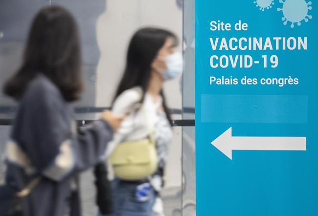 People wear face masks as they walk by a COVID-19 vaccination sign in Montreal, Sunday, Oct. 10, 2021, as the COVID-19 pandemic continues in Canada and around the world. THE CANADIAN PRESS/Graham Hughes