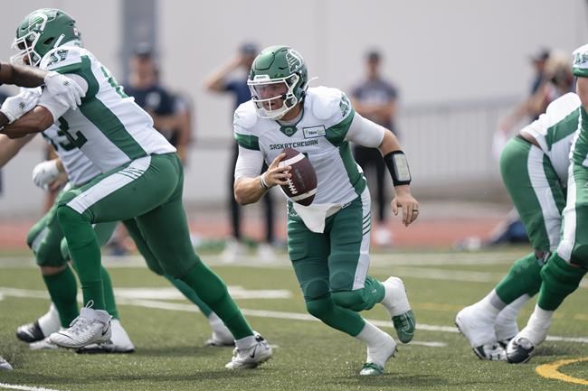 Saskatchewan Roughriders quarterback Cody Fajardo, centre, scrambles in the pocket during the first half of CFL action against the Toronto Argonauts at Acadia University in Wolfville, N.S., Saturday, July 16, 2022. THE CANADIAN PRESS/Darren Calabrese