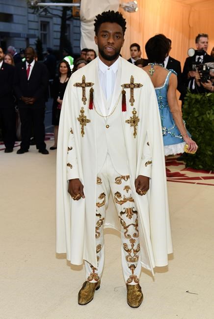 FILE - In this May 7, 2018 file photo, Chadwick Boseman attends The Metropolitan Museum of Art's Costume Institute benefit gala celebrating the opening of the Heavenly Bodies: Fashion and the Catholic Imagination exhibition in New York. Boseman, who played Black icons Jackie Robinson and James Brown before finding fame as the regal Black Panther in the Marvel cinematic universe, has died of cancer. His representative says Boseman died Friday, Aug. 28, 2020 in Los Angeles after a four-year battle with colon cancer. He was 43. (Photo by Charles Sykes/Invision/AP, File)