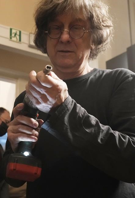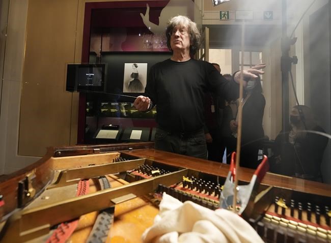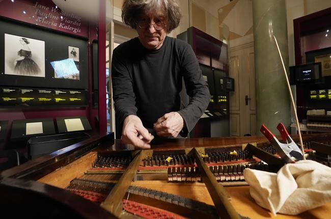Texas-born expert on historic pianos, Paul McNulty, renovates the last piano that Frederic Chopin played and composed on, at the Chopin museum in Warsaw, Poland, on Thursday, Dec. 9, 2021. The 1848 Pleyel piano was offered to Chopin's family after his 1849 death by Scottish pianist Jane Stirling, and survived two world wars in Warsaw, but had modern strings put in in the mid-20th century, that destroyed the tone. McNulty aims at bringing it back to its original characteristics. (AP Photo/Czarek Sokolowski)