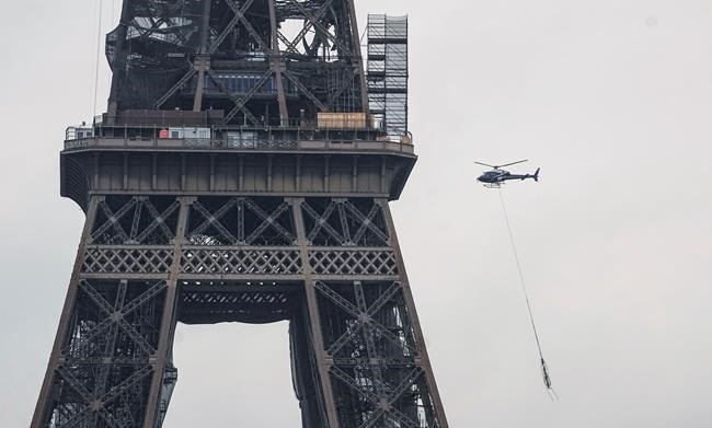 A new telecom transmission TDF (TeleDiffusion de France) antenna hanging from an Eurocopter Ecureuil 2 helicopter as the crew flies to install it on the top of the Eiffel Tower in Paris, Tuesday, March 15, 2022. The six meters antenna is raising the Eiffel Tower from 324 meters to 330 meters. (AP Photo/Michel Euler)