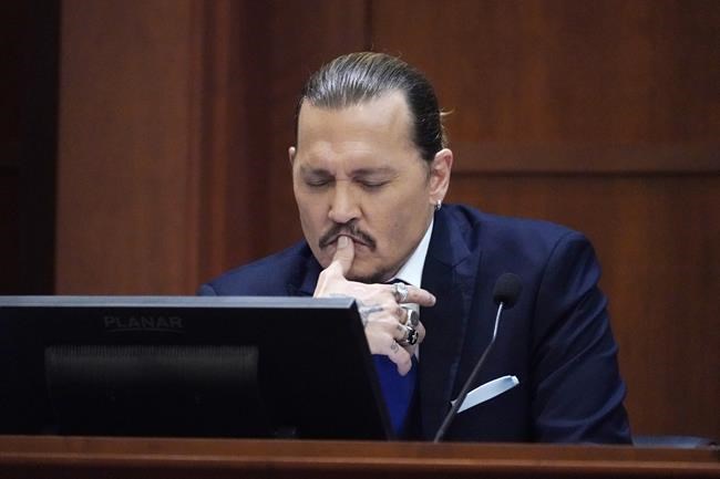 Actor Johnny Depp testifies in the courtroom at the Fairfax County Circuit Courthouse in Fairfax, Va., Monday, April 25, 2022. Depp sued his ex-wife Amber Heard for libel in Fairfax County Circuit Court after she wrote an op-ed piece in The Washington Post in 2018 referring to herself as a "public figure representing domestic abuse." (AP Photo/Steve Helber, Pool)