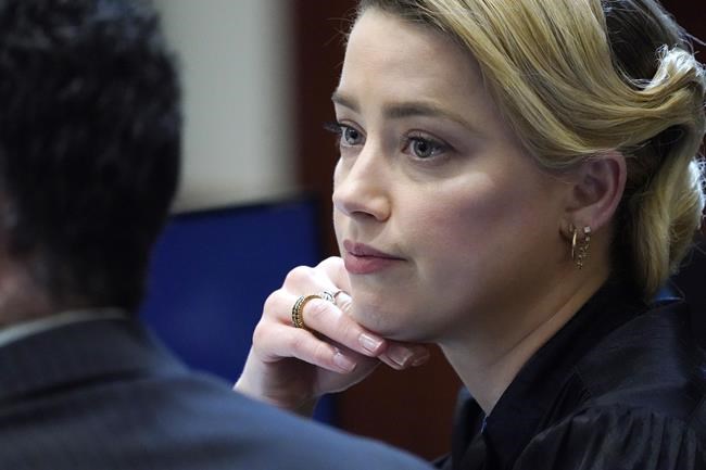 Actress Amber Heard talks to her attorney in the courtroom at the Fairfax County Circuit Courthouse in Fairfax, Va., Monday, April 25, 2022. Actor Johnny Depp sued his ex-wife Amber Heard for libel in Fairfax County Circuit Court after she wrote an op-ed piece in The Washington Post in 2018 referring to herself as a "public figure representing domestic abuse." (AP Photo/Steve Helber, Pool)