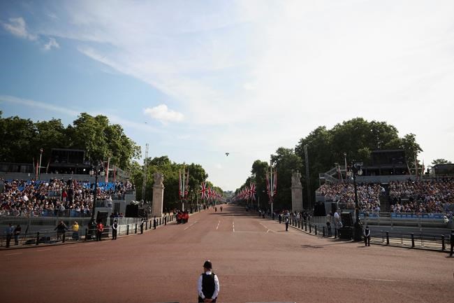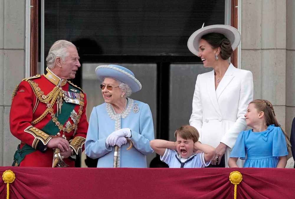 She basked in her moment. Smiling, she chatted with her great-grandson Prince Louis, 4, who occasionally covered his ears as 70 military aircraft old and new swooped low over the palace to salute the queen. The six-minute display included a formation of Typhoon fighter jets flying in the shape of the number 70.