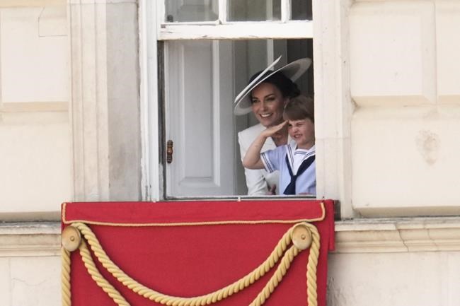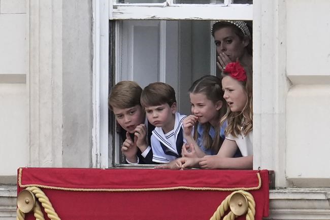 Cheers and the clop of hooves rang out Thursday as horse-drawn carriages carried members of the royal family, including Prince William’s wife, Kate, and their children Prince George, 8, Princess Charlotte, 7, and 4-year-old Prince Louis, from Buckingham Palace to Horse Guards Parade, a ceremonial parade ground about 1 kilometer (0.6 miles) away, for the Trooping the Color ceremony.
