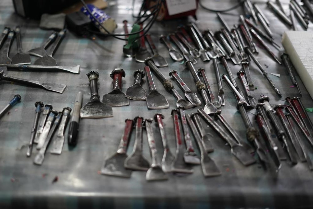 Tools used for “papel picado”, the traditional manufacture of tissue paper cut-out decorations, long used in altars for the Day of the Dead, lay on a table in a workshop in Xochimilco, a borough of Mexico City, Thursday, Oct. 27, 2022. Begun in the 1800s, experts say papel picado using tissue paper is probably a continuation of a far older pre-Hispanic tradition of painting ceremonial figures on paper made of fig-bark sheets. Mexican artisans adopted imported tissue paper because it was cheap and thin enough so that, with sharp tools, extreme care and a lot of skill, dozens of sheets can be cut at the same time. (AP Photo/Eduardo Verdugo)