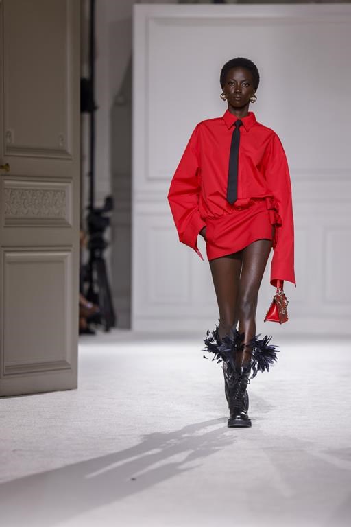 PARIS (AP) — Cars snaked for blocks dropping off countless VIPs for Valentino’s “black tie” show at Paris Fashion Week as the evening Paris lights bathed the nearby Arc de Triomphe. Its designer Pierpaolo Piccioli put on a star-studded collection that deconstructed the suit amid androgyny and sartorial plays.