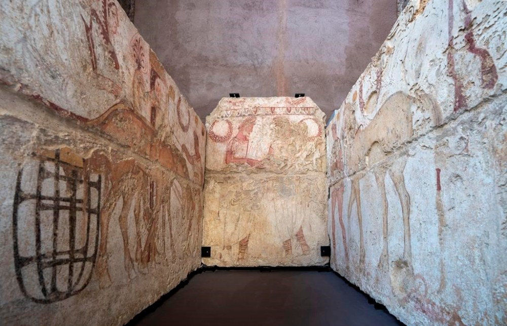 Painted slabs from a 3rd century BC male burial and depicting a funeral procession (right and left walls) and a scene of the deceased being welcomed into the underworld (back wall) are on display at the exhibition 'Between us and the ancients. The instant and eternity' in Rome's Diocletian Baths, Wednesday, May 3, 2023. The exhibition will open to the public from May 4 through July 30, 2023. (AP Photo/Domenico Stinellis)