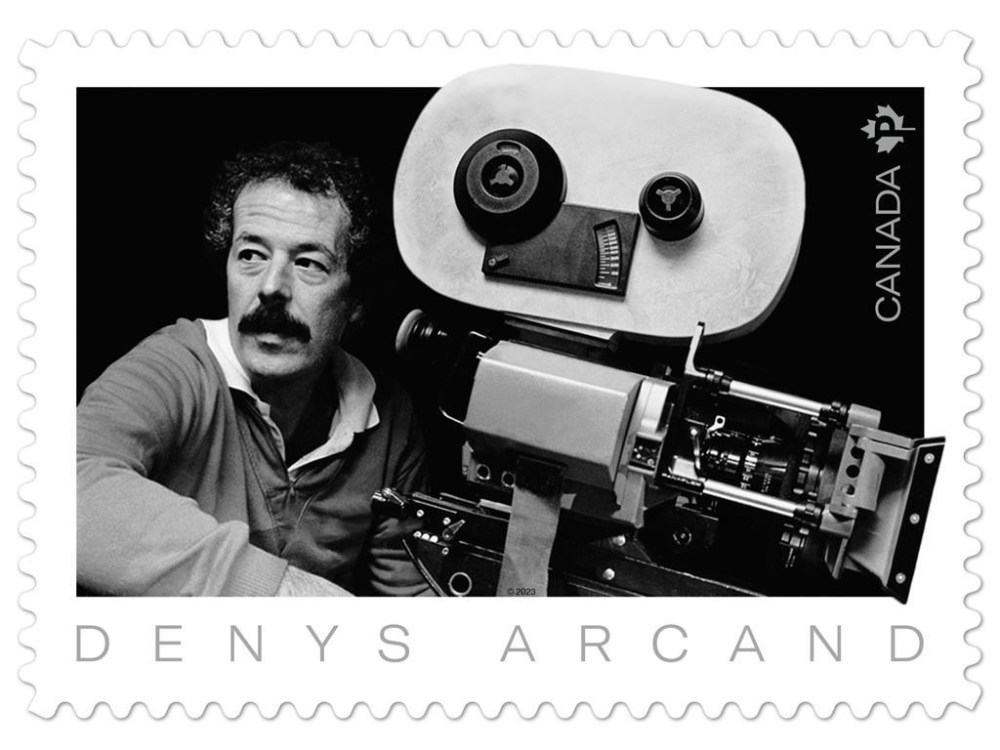 The stamp features a black and white photograph of Arcand seated behind a camera in 1985, when the Quebec-born auteur shot his Oscar-nominated comedy, “The Decline of the American Empire.”