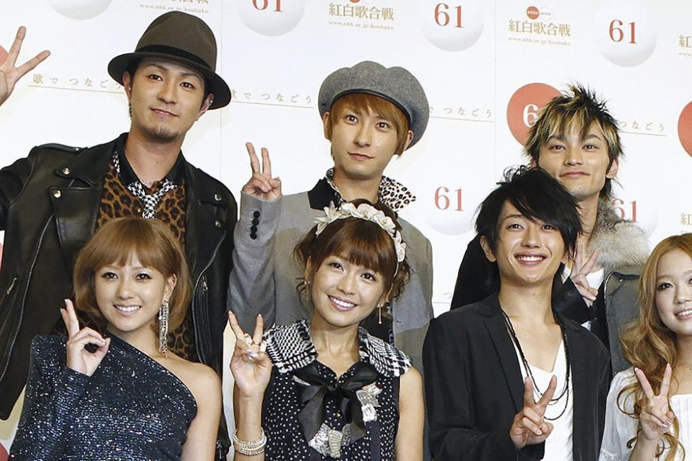 Japanese pop star Shijiro Atae, rear center, poses with others during an announcement for a year-end TV music show in Tokyo on Nov. 24, 2010. Atae said he is gay in an emotional announcement at a fan event Wednesday, July 26, 2023, that was warmly welcomed in a country where the government does not recognize LGBTQ equality. (Kyodo News via AP)