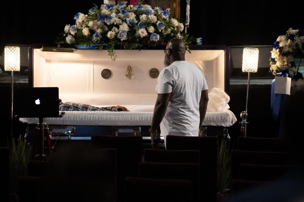 O'Shae Sibley's father Jake Kelly, stands by his son's casket during a celebration of life for Sibley on Tuesday, Aug. 8, 2023, at The Met Philadelphia, in Philadelphia. Friends and family members gathered Tuesday to remember Sibley, who was fatally stabbed after he confronted teenagers who taunted his group of gay, Black friends as they danced at a New York City gas station. (AP Photo/Joe Lamberti)