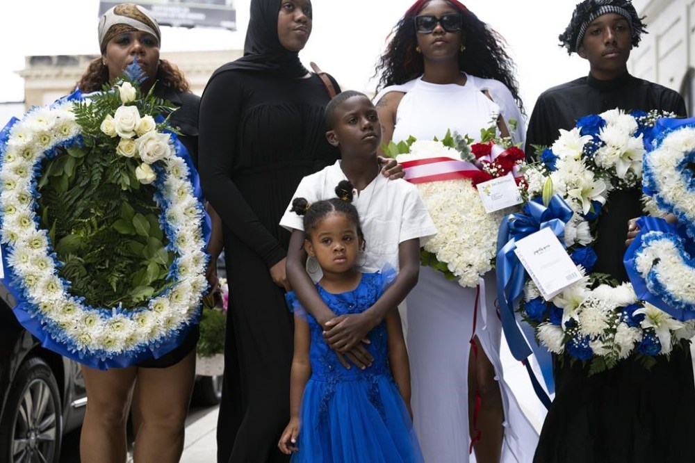 Family members gather outside following during a celebration of life for O'Shae Sibley on Tuesday, Aug. 8, 2023, at The Met Philadelphia, in Philadelphia. Friends and family members gathered Tuesday to remember Sibley, who was fatally stabbed after he confronted teenagers who taunted his group of gay, Black friends as they danced at a New York City gas station. (AP Photo/Joe Lamberti)