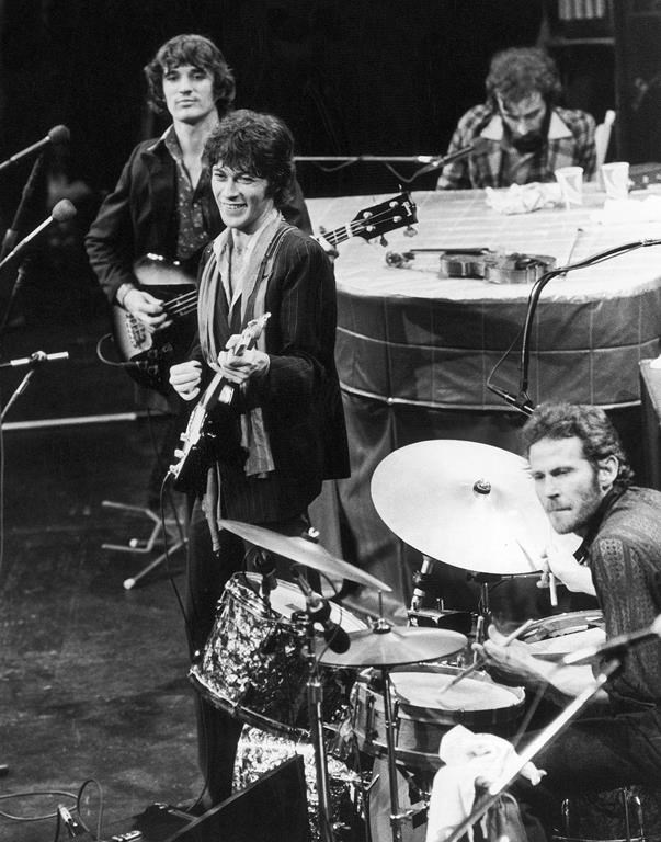 FILE - The Band, featuring Richard Manuel on piano, Levon Helm on drums, lead guitarist Robbie Robertson (smiling), bass guitarist Rick Danko, and organist Garth Hudson (not shown), take the stage for their final live performance before a crowd of 5,000 at Winterland Auditorium in San Francisco on Nov. 27, 1976. Robertson, The Band’s lead guitarist and songwriter who in such classics as “The Weight” and “Up on Cripple Creek” mined American music and folklore and helped reshape contemporary rock, died Wednesday, Aug. 9, 2023. He was 80. (AP Photo/John Storey, File)