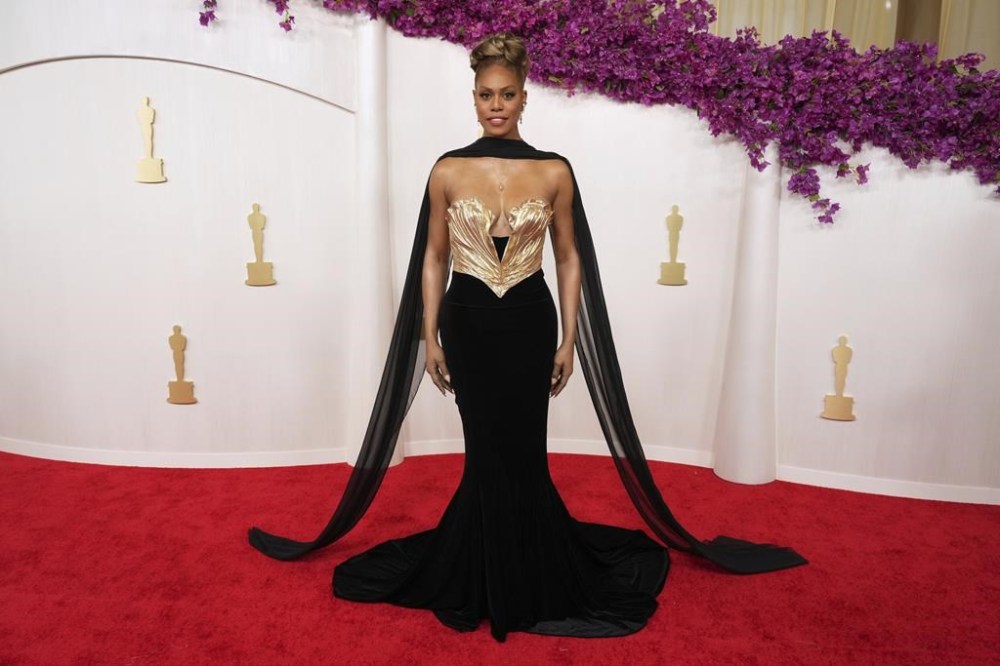 Laverne Cox, working the carpet for E!, was the epitome of Old Hollywood glam in an hourglass look of black and low-plunging gold, her hair piled high as she fluttered a feather-light neck piece that trailed behind. Her look was vintage Mugler.