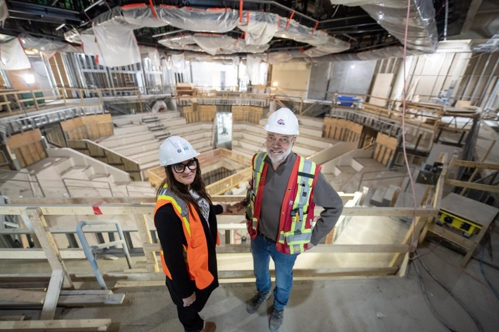 Jaime Boldt, left, executive director and principal consultant of the Globe Theatre, and Dean Tanner, project manager with Ledcor Construction, stand in the main theatre during a tour of the construction site of the renovation of the Globe Theatre in Regina, Thursday, April 4, 2024. THE CANADIAN PRESS/Liam Richards