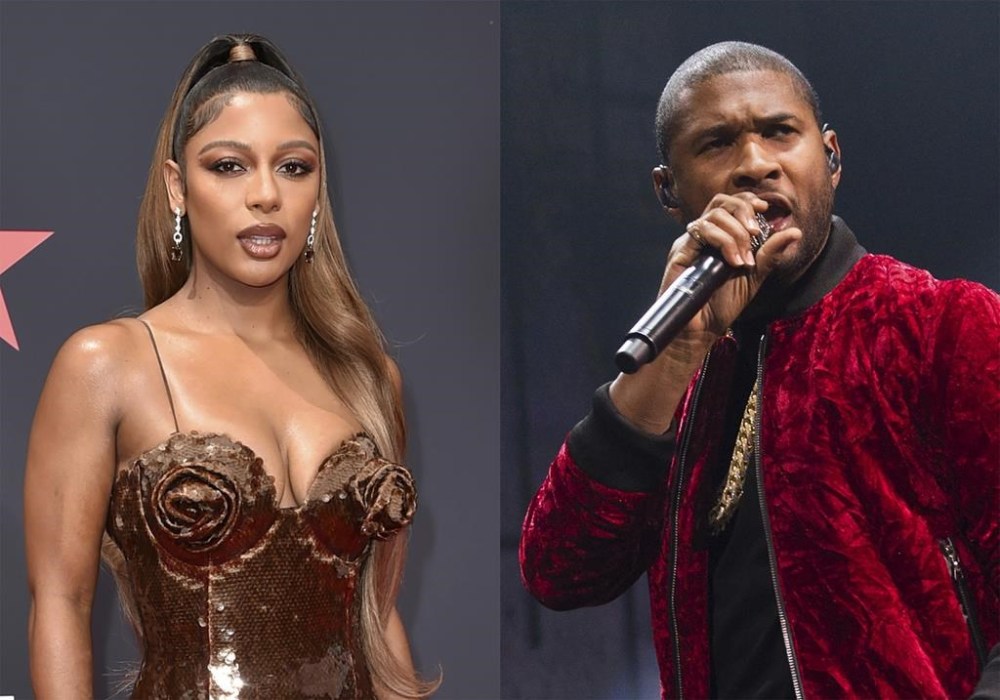 This combination of photos shows Victoria Monet at the BET Awards in Los Angeles on June 26, 2022, left, and Usher performs at Power 105.1's Powerhouse 2016 at Barclays Center in New York on Oct. 27, 2016. (AP Photo)