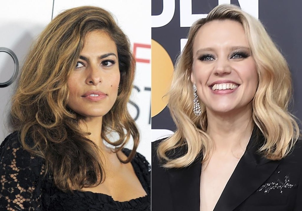 Actress Eva Mendes appears at the "Holy Motors" special screening as part of AFI Fest in Los Angeles on Nov. 3, 2012 , left, and Kate McKinnon appears at the 77th annual Golden Globe Awards on Jan. 5, 2020, in Beverly Hills, Calif. (AP Photo)