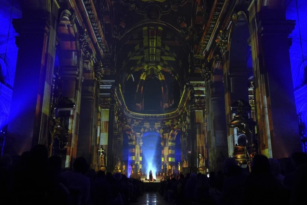 “We then ‘unfold’ it like origami … and put it back into 3D to be projected as a single unified image. We have over 45 projectors, each covering a part of the vaults, a section of a pillar, or a piece of the nave. It’s … a mosaic of images to form one large picture.”
