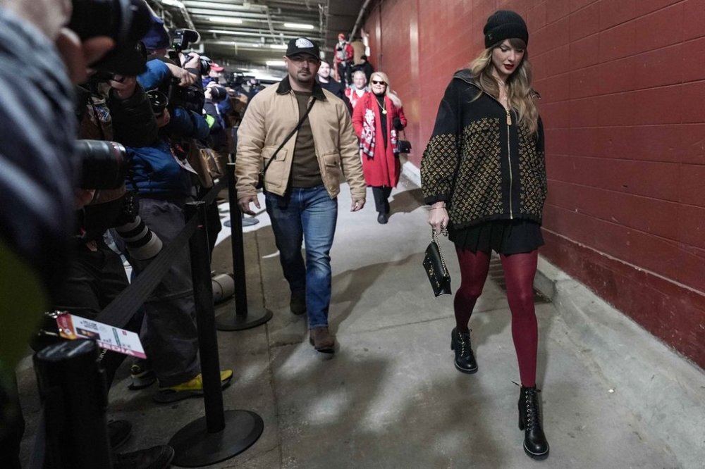 On Sunday, Swift walked toward her usual suite about 90 minutes before kickoff against Buffalo. And while she was decked out in Chanel for their divisional-round win over Houston, Swift opted for a sleek black-and-gold Louis Vuitton look for the AFC title game, including a jacquard knit jacket that retails for $5,000 and a stocking cap with a list price of $830.