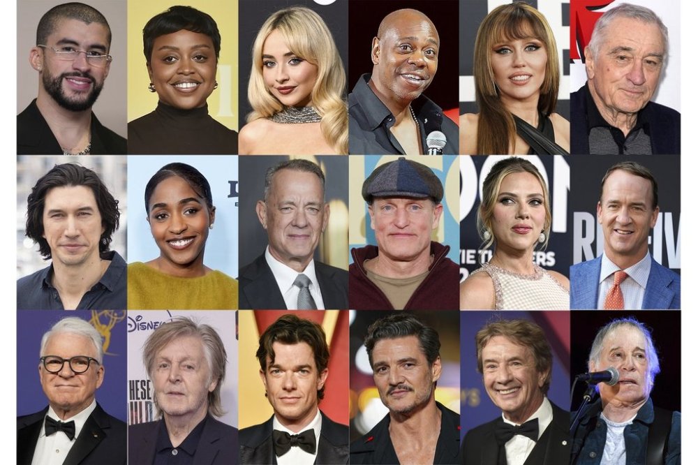 This combination of photos shows, top row from left, Bad Bunny, Quinta Brunson, Sabrina Carpenter, Dave Chappelle, Miley Cyrus, Robert De Niro, second row from left, Adam Driver, Ayo Edebiri, Tom Hanks, Woody Harrelson, Scarlett Johansson, Peyton Manning, and bottom row from left, Steve Martin, Paul McCartney, John Mulaney, Pedro Pascal, Martin Short and Paul Simon. (AP Photo)