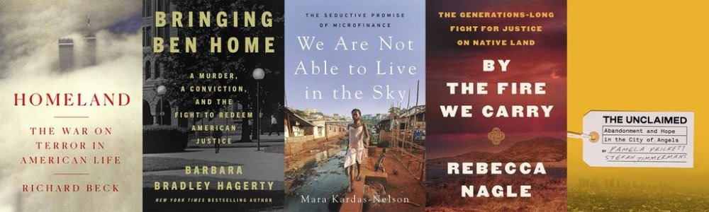 Book prize finalists are Richard Beck’s “Homeland: The War on Terror in American Life,” Barbara Bradley Hagerty’s “Bringing Ben Home: A Murder, a Conviction, and the Fight to Redeem American Justice,” Mara Kardas-Nelson’s “We Are Not Able to Live in the Sky: The Seductive Promise of Microfinance,” Rebecca Nagle’s “By the Fire We Carry: The Generations-Long Fight for Justice on Native Land” and Pamela J. Prickett’s and Stefan Timmermans’ “The Unclaimed: Abandonment and Hope in the City of Angels.”