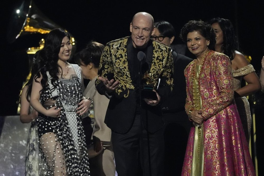 FILE - Eru Matsumoto, from left, Wouter Kellerman, and Chandrika Tandon accept the award for best new age, ambient, or chant album for "Triveni" during the 67th annual Grammy Awards on Sunday, Feb. 2, 2025, in Los Angeles. (AP Photo/Chris Pizzello)