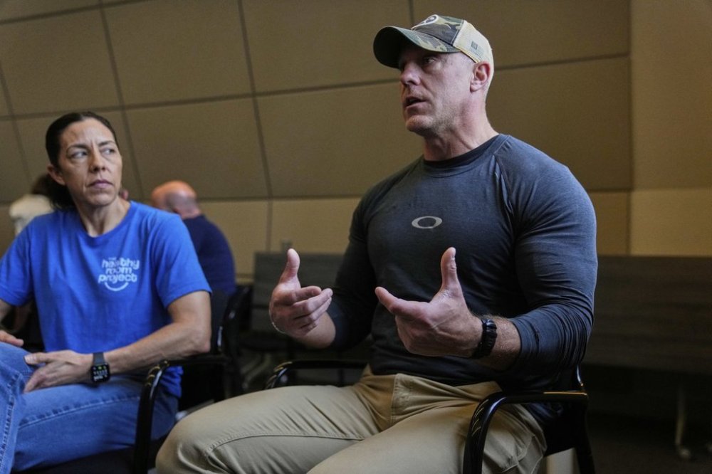 Albuquerue Police Department Cmdr. Ray Del Greco, right, and Los Angeles Police Department Cpt. Yvonne Ortiz participate in an improvisational exercise lead by The Second City instructors during a University of Chicago Crime Lab class that is part of the Policing Leadership Academy program, on April 11, 2025, in Chicago. (AP Photo/Erin Hooley)