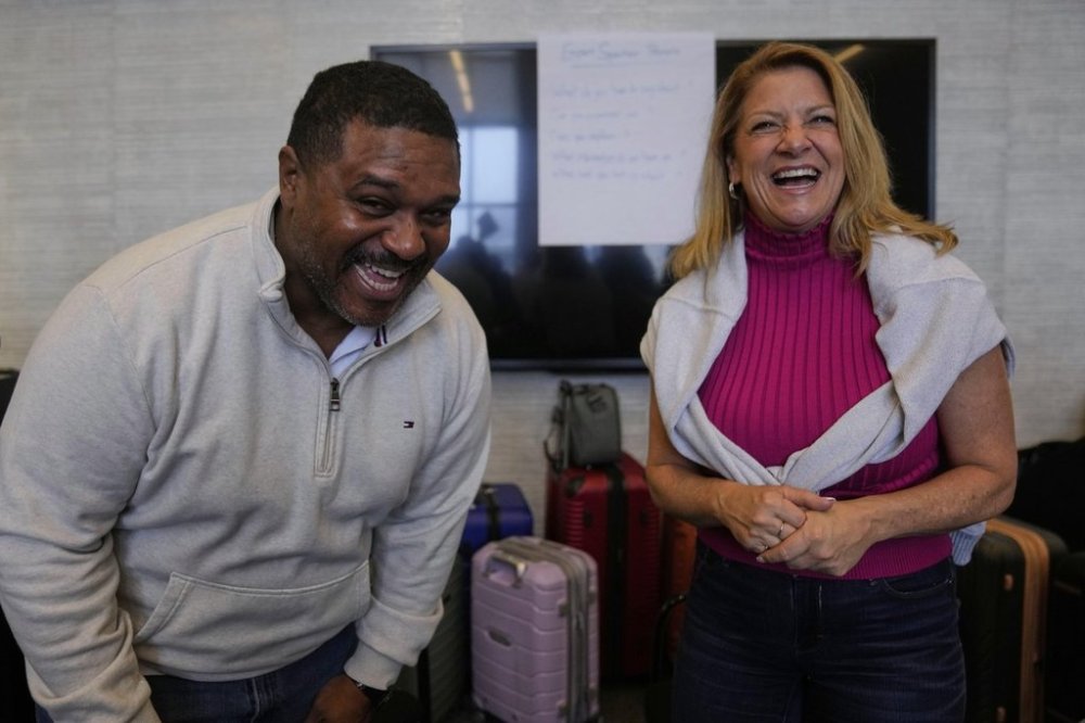 Rocky Mount Police Department Capt. James Staten, left, and Luann Pannell, director of instructional design and academic innovation with the Policing Leadership Academy, participate in an improvisational exercise lead by The Second City instructors during a Univeristy of Chicago Crime Lab class that is part of the Leadership program, on April 11, 2025, in Chicago. (AP Photo/Erin Hooley)