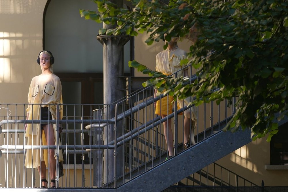 MILAN (AP) — Models descended an emergency escape staircase to access the Francesca Liberatore runway during Milan Fashion Week on Sunday, as if to beckon the world to find a route away from the desperate human suffering around the globe.
