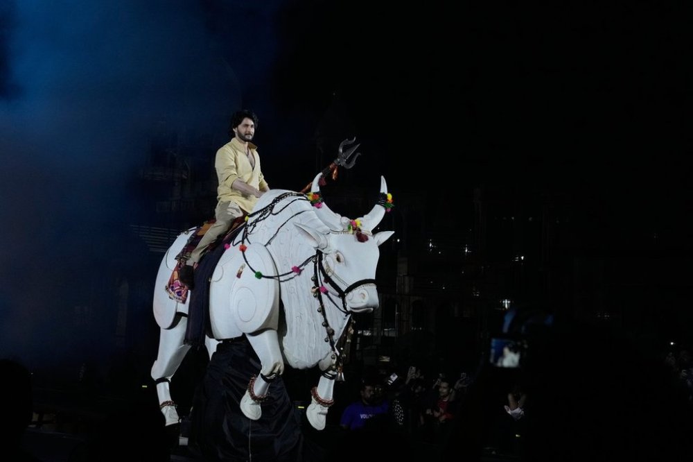 Thousands of frenzied fans watched the film’s first glimpse on a mammoth 110-by-130-foot (33.5-by-39.5-meter) screen flanked by replicas of Varanasi city. A display of colorful lights and dazzling fireworks lit up the venue as crowds danced to the foot-tapping tunes of Telugu music — a mix of new songs and classics — turning the event into a vibrant festival.