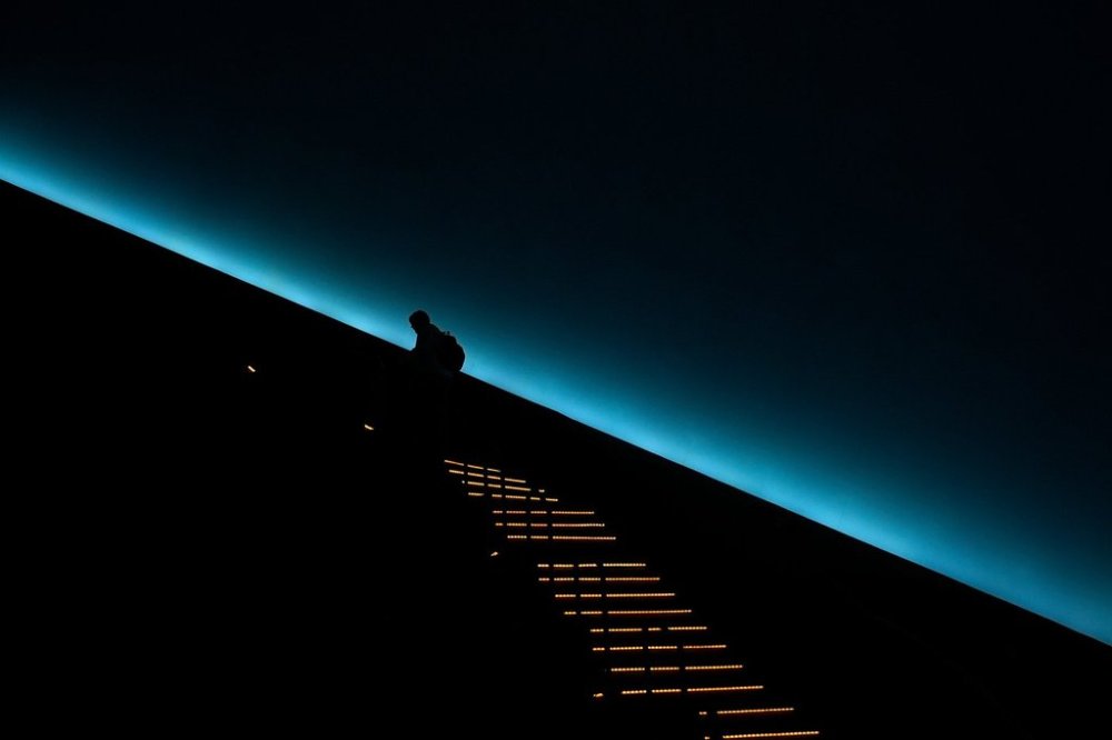 A patron climbs to their seat before a viewing of "Ohio: Wild at Heart" film that features the state's top-rated park system to highlight wildlife conservation efforts and the restorative power of outdoor recreation at the Robert D. Lindner Family OMNIMAX Theater at the Cincinnati Union Terminal, Tuesday, Dec. 30, 2025, in Cincinnati. (AP Photo/Carolyn Kaster)