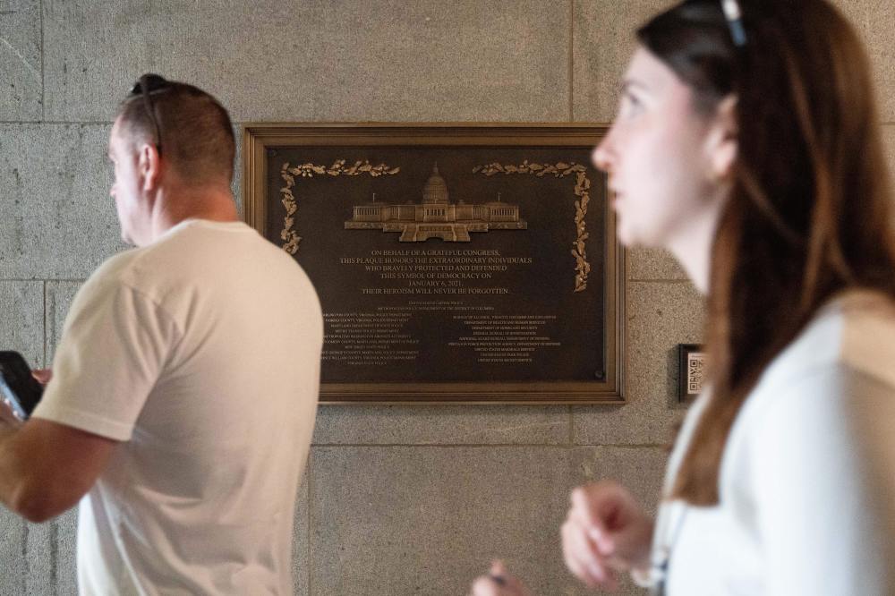A tour group walks by a plaque honoring police service on Jan. 6, 2021 at the Capitol, Saturday, March 7, 2026, in Washington. (AP Photo/Allison Robbert)