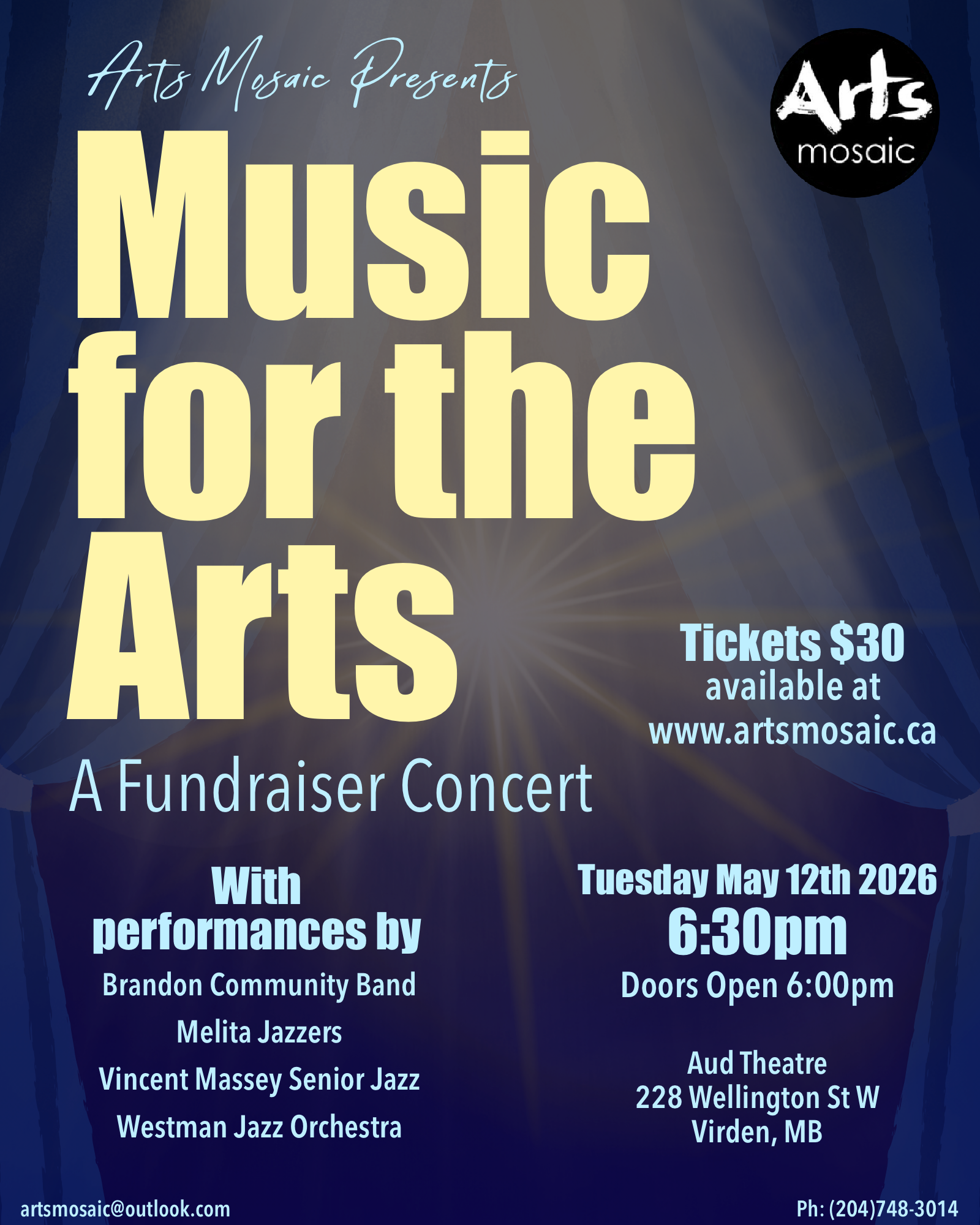 Arts Mosaic proudly presents Music for the Arts: A Fundraiser Concert! Featuring performances by Brandon Community Band, the Melita Jazzers, Vincent Massey Senior Jazz band and the Westman Jazz Orchestra. This concert aims to support arts and music education in Westman. Funds raised by this event will be split between Arts Mosaic and the performing […]