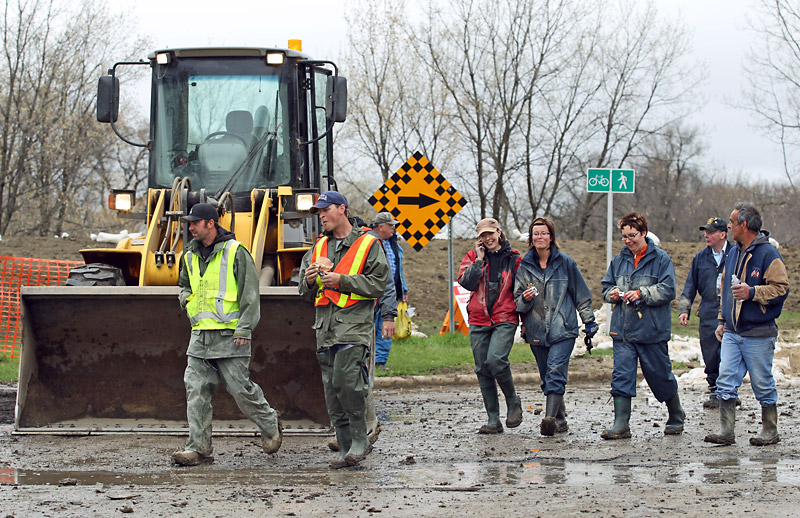Volunteers walk along the dikes being constructed near Fifth Street North and Stickney Avenue on Monday afternoon. The city has an ongoing need of volunteers to bolster the work crews battling the rising Assiniboine River.