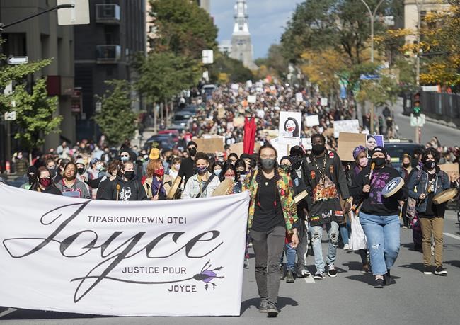 People take part in a protest called 'Justice for Joyce' in Montreal, Saturday, Oct. 3, 2020, where they demanded Justice for Joyce Echaquan and an end to systemic racism. THE CANADIAN PRESS/Graham Hughes